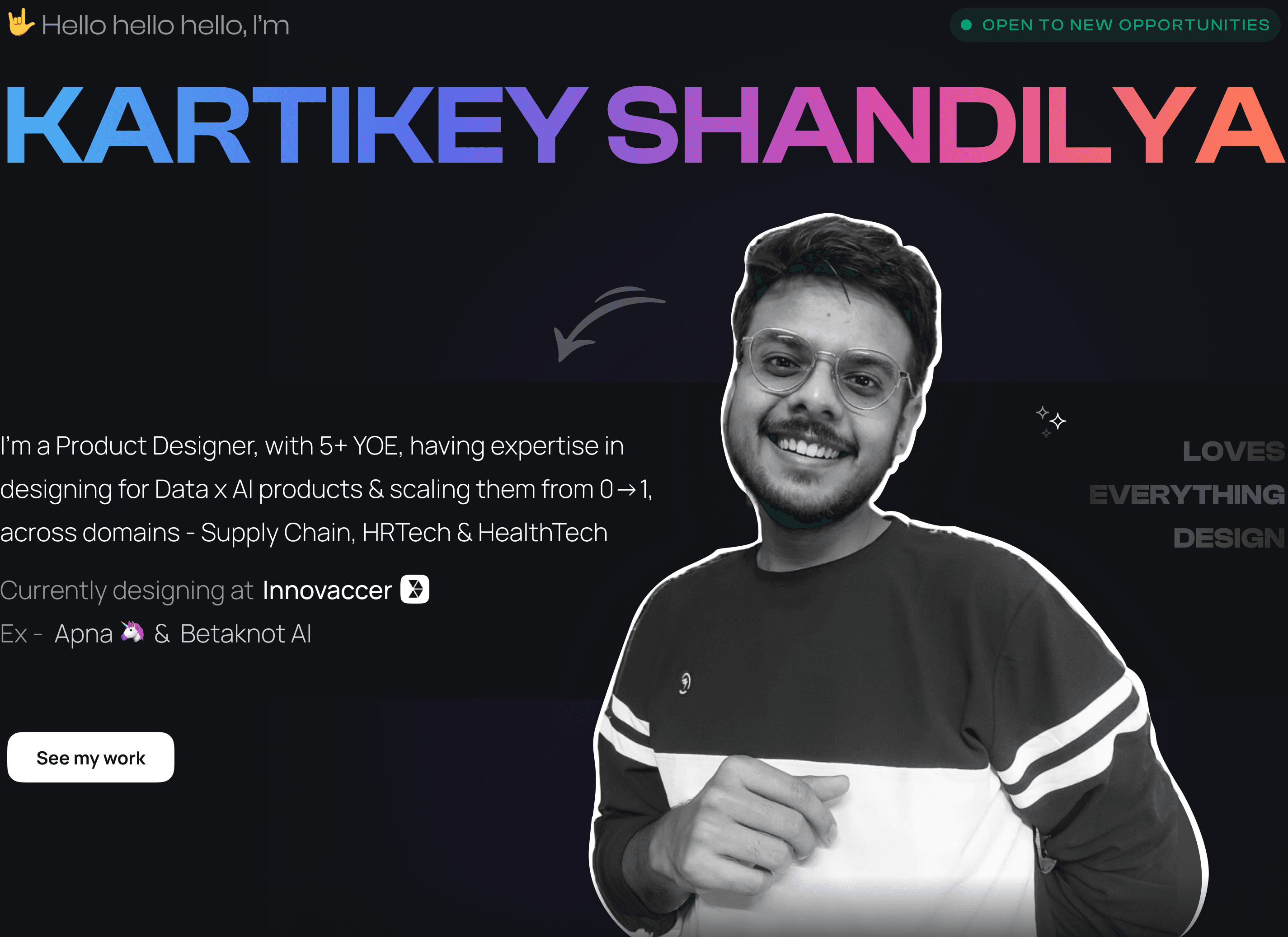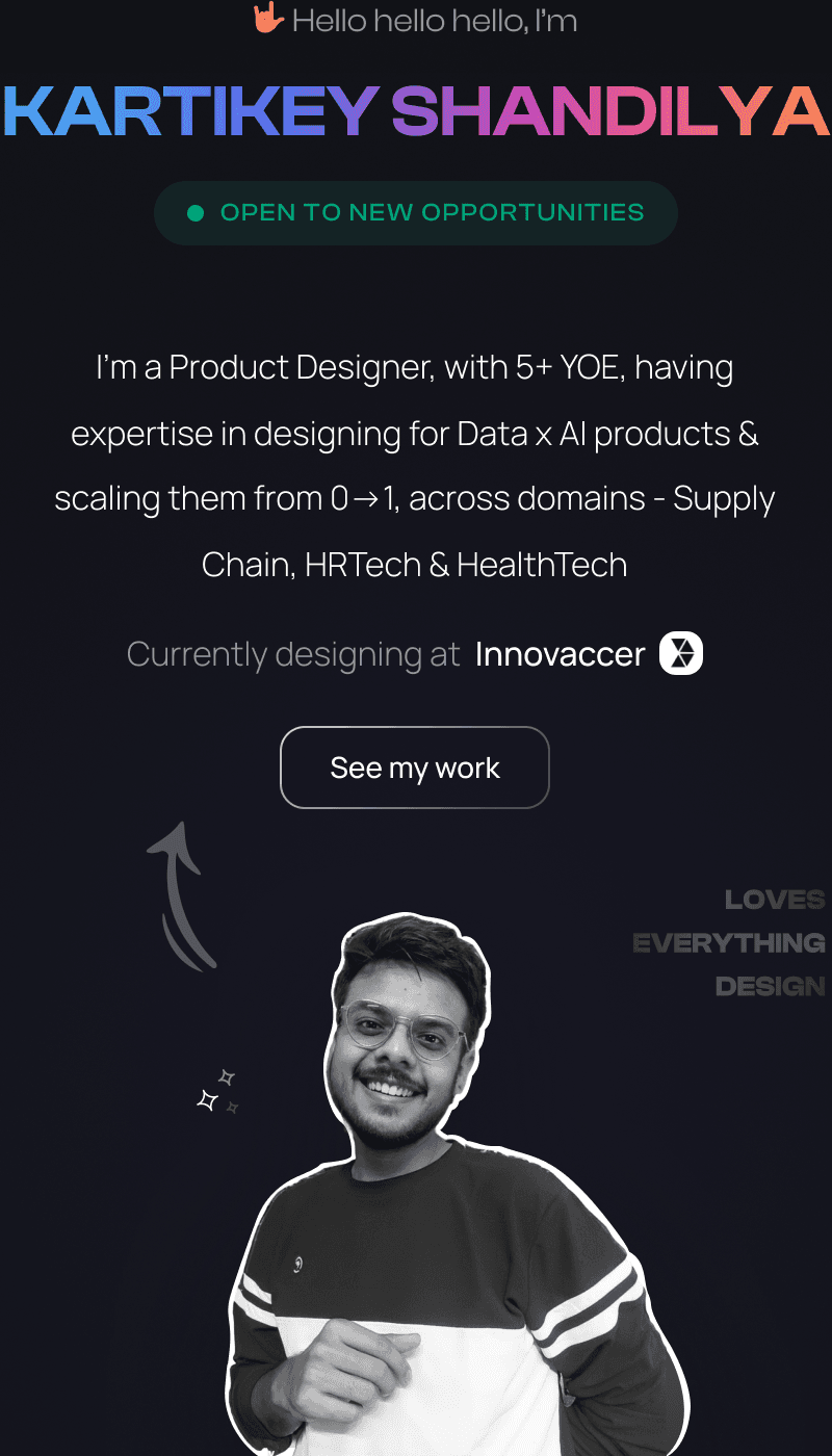 Beyond his design skills, this guy can write. Not just emails and text messages, but the kind of writing that makes you nod, laugh and think—all at the same time. It's a rare skill in the world of design. In short, Kartikey is a highly talented and dedicated product designer who brings a wealth of skills, creativity, and a positive attitude to every project.